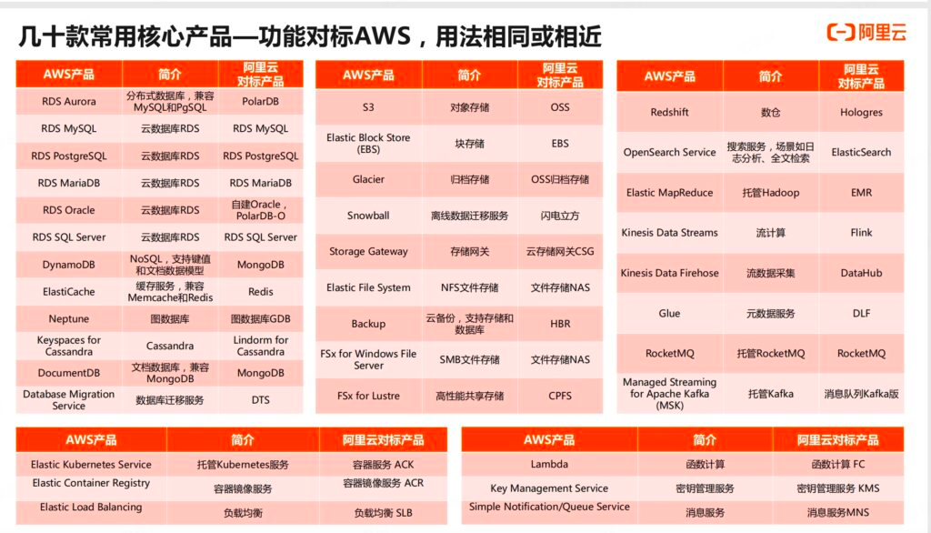 图:阿里云与AWS几十款常用核心产品功能对标与用法对照