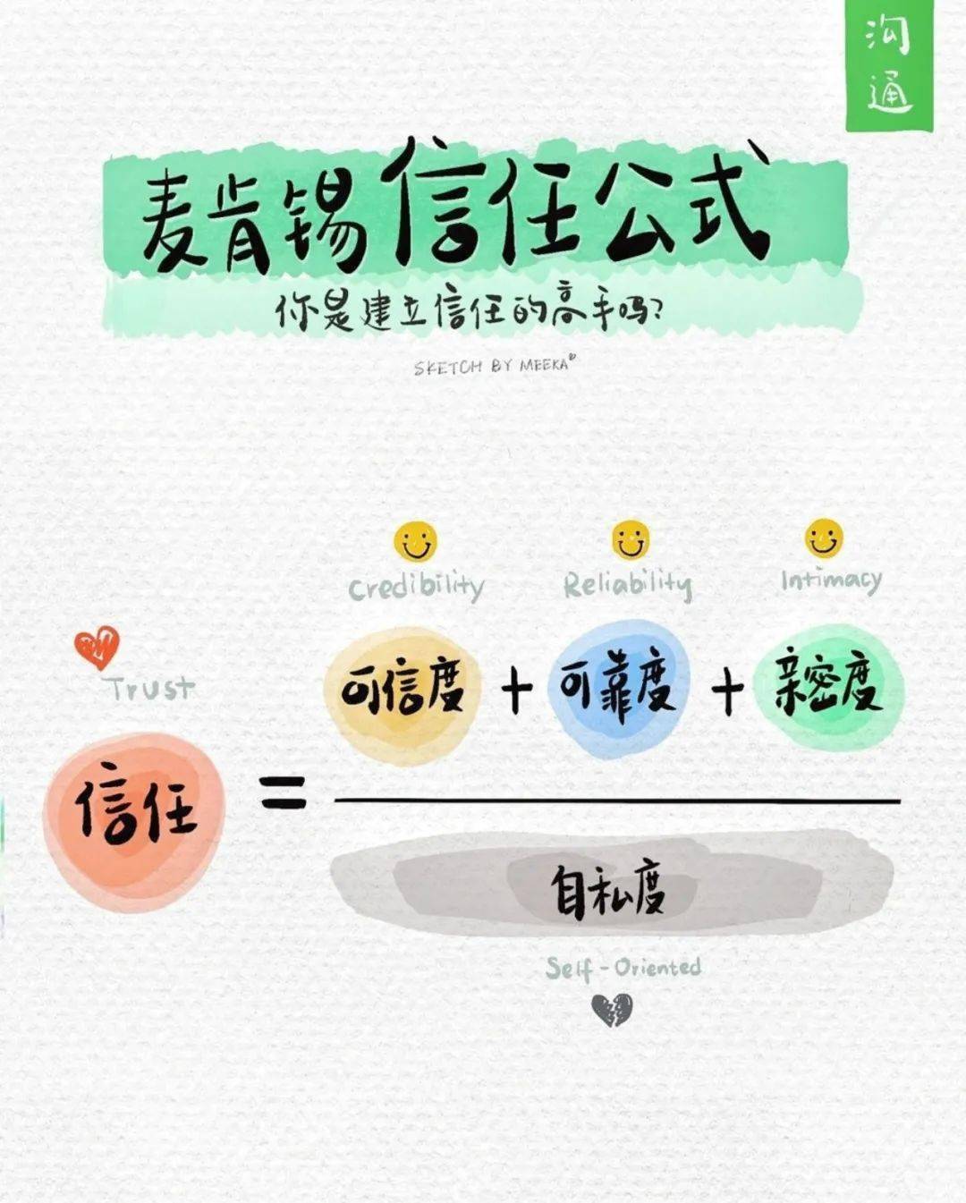 麦肯锡解释的信任方程概念,这是一种用数学方法来描述和衡量信任的方式。信任在组织内部和外部关系中扮演着至关重要的角色,直接影响团队合作、客户满意度、创新和整体绩效。