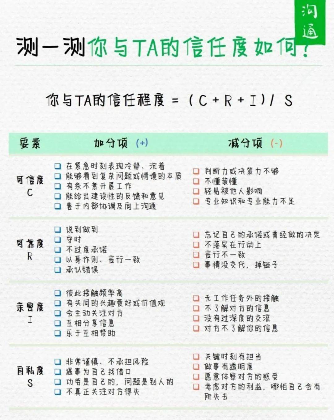 | 团队合作 | 信任是高效团队合作的基石 | 信任度高的团队中,成员会开放分享想法和担忧,促进创新和解决问题 |